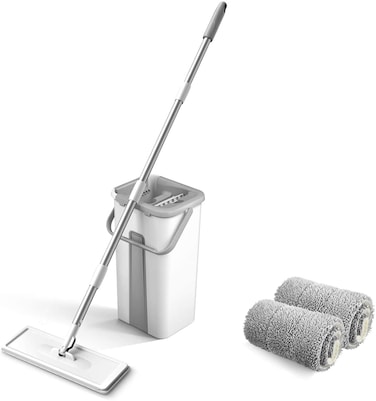 - • Mop with bucket for easy storage. Mop pads easily attach to mop head and can be removed and washed quickly and easily.