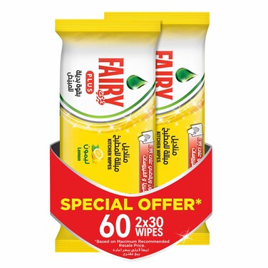 Fairy Kitchen Wipes with Alternative Power to Bleach for Dishes and Kitchen Surfaces Lemon 2x30 Wipes Special Offer