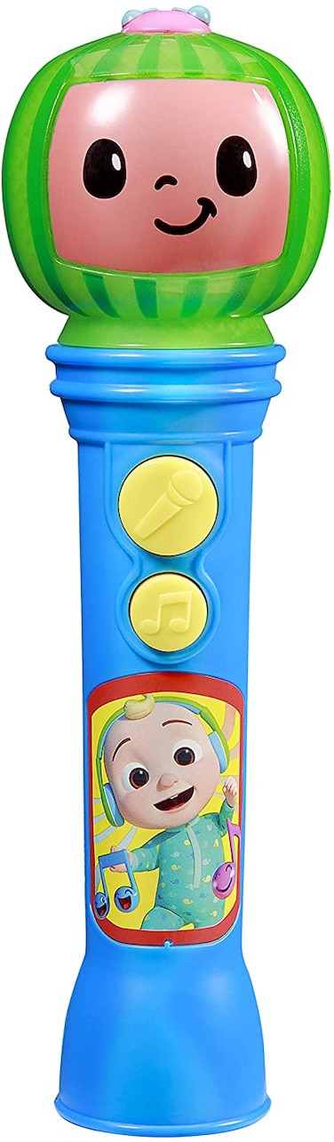 This Cocomelon toy microphone will turn any toddler into the star of the show! Music from the popular YouTube channel is built right into this play microphone for kids, so you can sing along with the push of a button! Press the Song Button to play the built-in song, and press and hold the Microphone Button while you sing along to amplify your voice. The colorful, eye-catching lights enhance your performance, too. Lightweight, durable, and portable, this toy microphone for kids goes anywhere you want to sing your heart out. Kid-friendly controls make it easy to start the ultimate singalong together. Cocomelon toys are a great gift for any little performer!