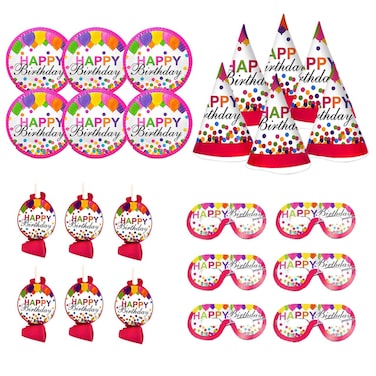 Package Included: 6 x 6” party plates, 6 x 6” Party Cone Hats, 6 x Party Blowers, 6 x Party Masks