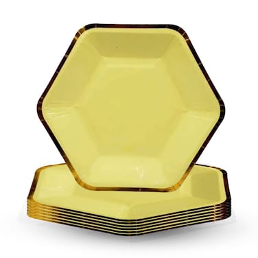 - PACKAGE INCLUDES- 6 Pastel yellow scalloped edged party plates. Each hexagon shaped paper plate measures approximately 9 inches.