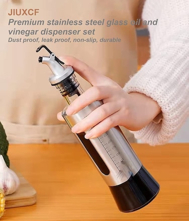 ✅【HIGH QUALITY 】olive oil dispenser are made of high quality lead-free glass and stainless steel material, The stainless steel glass oil dispenser more textured and firm,100% food-grade glass. It will not be to produce other substances that is harmful to health.