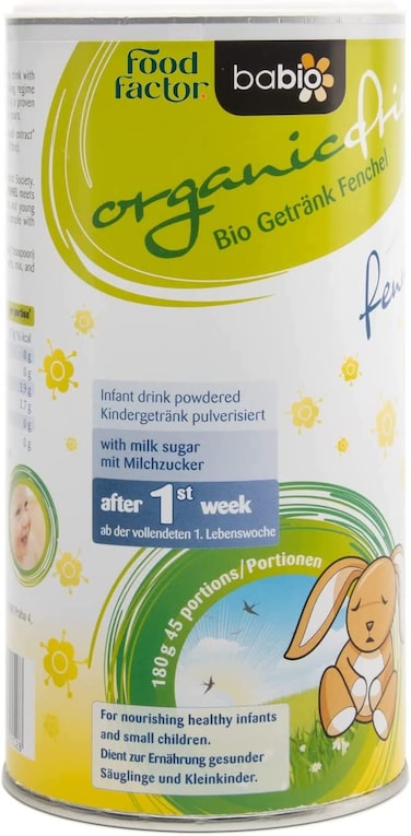 BABIO FENNEL organic powdered baby drink with milk sugar. Contributes to good drinking regime of infants and young children. Fennel is a proven remedy and is used in baby nutrition for years For nourishing healthy infants and small children. INSTRUCTION FOR USE: Dissolve 4g of granules (1 teaspoon) in 100 ml of boiled water suitable for infants, mix, and cool to 30 °C. Do not sweeten! Storage: always store the opened dose well sealed in a dry place (up to 60% relat. humidity) and at a temperature up to 25 °C. Use within 40 days after opening