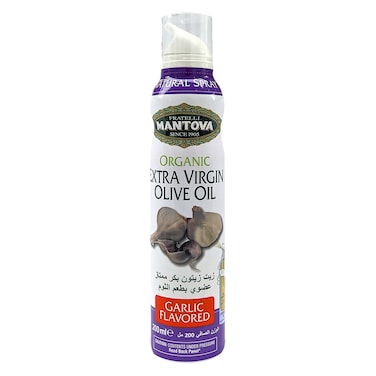 - Mantova Spray Garlic Extra Virgin Olive Oil is an all-natural product that has a great balance of garlic and extra virgin olive oil flavour