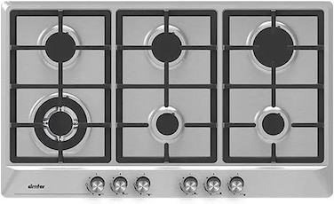 90 cm Gas Hob, Wito Series, SS plate, Euro pool type 6 gas burners, Front Control, FFD System, Auto Ignition, cast iron pan support, A3 model inox capped & Grey body Knobs