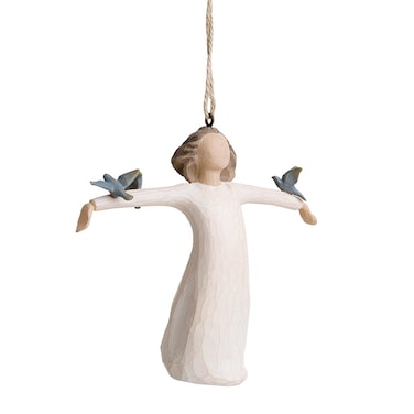 - Willow Tree is an intimate line of figurative sculptures that speak in soothing ways to heal, comfort, protect, and inspire. Artist Susan Lordi hand-carves each original Willow Tree sculpture. This piece is cast from its original sculpture, then hand painted. This classic ornament represents a Willow Tree angel in miniature size. Ornament features an angel with blue birds on each outstretched arm. Product is supplied in a branded gift box with insert insert containing a signed note from Susan Lordi and a gift card including the sentiment: “Freedom to Sing, Laugh, Dance...Create!” With space for your personal message. Made of resin and painted with lead-free paint.