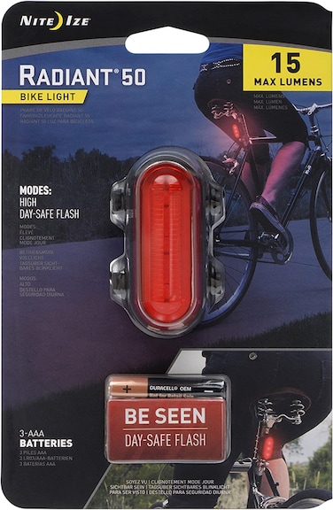 Nite Ize Radiant 50 Red LED Bike Light is the bright solution to ensuring you stay visible to both traffic and pedestrians while out for a ride. This handy light attaches securely to your bike's seat post thanks to its curved rubber back and silicone attachment rings. The light emits a widespread red beam that will be clearly seen by approaching traffic, keeping you safely visible as you ride at night. The Radiant 50 also comes with a special flashing output for daytime use when you want to make yourself more noticeable to oncoming vehicles. Powered by a trio of AAAs, this handy bike light can run for up to 20 hours before needing to switch out batteries, giving you plenty of safe riding time. Comes in red colour.