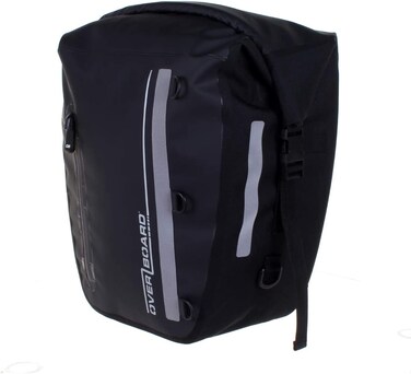 Overboard Black Classic Waterproof Bike Pannier is made of durable PVC tarpaulin, they wipe clean easily after use, while the trusty fold seal system and high frequency welded seams ensure your contents are fully protected from the elements. Complete with a shaping hard base plate, an outer weatherproof zip pocket, elasticated side loops for lights and reflective front and side patches throughout, our feature-packed waterproof cycling panniers are just the ticket for all-weather cyclists.