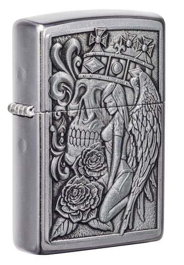 - Death and Life become one in this Skull and Angel Emblem Design. Beautifully illustrated in black and white on this emblem is a skull donning a crown and an angel. Roses and filigree are added to this design to bring a touch of elegance to this dark piece. This gothic style emblem is then attached to a Street Chrome lighter. Comes packaged in a gift box. For optimal performance fill with Zippo lighter fuel. Genuine Zippo windproof lighter with distinctive Zippo "click". All metal construction; windproof design works virtually anywhere. Refillable for a lifetime of use; for optimum performance, we recommend genuine Zippo fluid, flints, and wicks. Made in USA; Lifetime guarantee. Fuel: Zippo lighter fuel (sold separately) Note: Colors on the Multi Color lighter may vary from the picture shown.