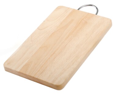 - Extra-large cutting surface to meet the need of various food preparations. Natural color and texture that blends seamlessly with most countertops. Strong metal handle for hanging the cutting board after each use to minimize footprint. Double sided board allows one surface to be utilized as a serving plate for foods. This wooden cutting board is crafted out of rubberwood for sturdy durability and environmentally friendly. Hand wash with warm soapy water and dry promptly. Made in Thailand. Dimensions: 20 x 30 x 2cm