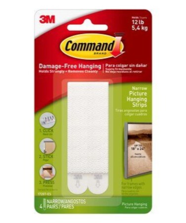 - No more nail holes, cracked plaster or sticky residue. Command Picture Hanging Strips make decorating quick and easy. One click tells you Picture Hanging Strips are locked in and holding tight. Best of all, when you are ready to take down or move your pictures, they come off cleanly - no nail holes, cracked plaster or sticky residue. Command Picture Hanging Strips come in three sizes: Small strips hold most 8" x 10" frames, medium strips hold most 18" x 24" frames and large strips hold most 24" x 36" frames. Also available are Command Frame Stabilizer Strips which keep picture frames level even if hung by nails. Contains 4 sets of strips. Holds up to 3 pounds per set.