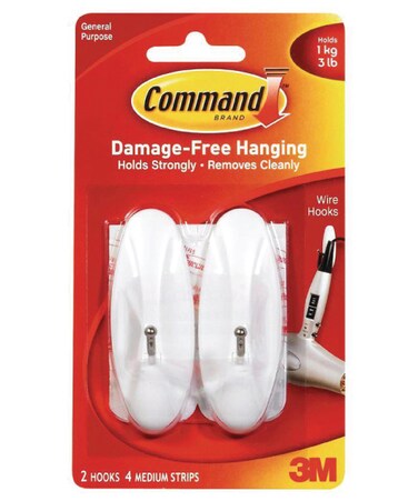 - Command Hooks are available in a wide range of designs to match your individual style and decor. They also come in a variety of sizes and hold a surprising amount of weight up to 7.5 lbs. Forget about nails, screws and tacks, Command Hooks are fast and easy to hang. Using the revolutionary Command Adhesive, holds strongly on a variety of surfaces, including paint, wood, tile and more. Yet, removes cleanly no holes, marks, sticky residue or stains. Rehanging them is as easy as applying a replacement Mounting Strip, so you can take down, move and reuse them again and again. Contains 2 hooks, 4 strips. Holds up to 3 lbs.