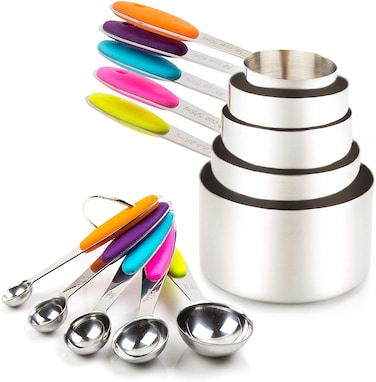 - <p>MULTIPLE SIZES: Meet all your needs on cooking and baking. Includes 5 stainless steel measuring cups (1/8 cup,1/4 cup, 1/3 cup, 1/2 cup,1 cup) and 5 stainless steel measuring spoons (1/4 tsp, 1/2 tsp, 1 tsp, 1/2 tbsp, 1 tbsp).<p>STURDY AND DURABLE: Made of unbreakable high quality rustproof heavy duty, mirror-polished 18/8 304 stainless steel. Our handles will never bend when handling dry or wet ingredients.<p>ELEGANT DESIGN: Oval mouth cup design looks awesome and makes it very easy to pour the ingredients. The nesting option is great for storage space and neatness.<p>EASY GRIP HANDLE & EASY STORAGE: Different colors representing different sizes, very convenient for you to choose the correct one when baking, help you save precious time. The measuring cups are stackable and hooked together with a steel ring, you can hang them or put them in a drawer.<p>100% Satisfaction Guaranteed! If you face any issue, there is no need to worry because we've got you covered. Just let us know and we will resolve any issue you encounter as soon as possible<p>Size:10 Piece<p>Are you looking for a solution to measure the accurate amount of ingredients to prepare the perfect food for you and your family?<p> Then you are at right place! <p> This measuring cup set fulfills all needs of the professional and the everyday chef!<p> Measure and prepare perfect meal:<p> Measure all dry and liquid ingredients with accurate amount. Measuring cups and spoons set will help you prepare your recipe to precision. <p> Heat and cold resistant:<p> Our stainless steel measuring set of 5 cups and 5 spoons are made of heat and cold resistant material. Now you can cook your food without worry. <p> No more guesswork:<p>Readable measurements are easy to read in milliliters and ounces. Our utensil accuracy is lab-d giving the best results when cooking and baking.