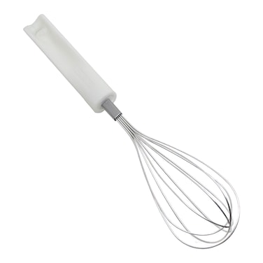 It features a comfortable handle that allows for easy grip and control while whisking. The whisk is made of durable white and silver materials, ensuring long-lasting use.