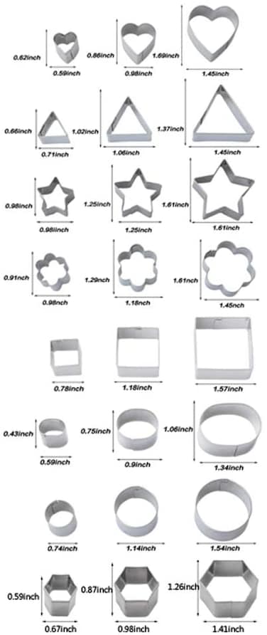 - <p>[MULTIPURPOSE]Biscuit Cutter Set is widely used: including cutting cookies, pastries, dough, fondant, empanadas, crumpets, tarts, canapes, doughnuts, vegetables, English muffins, bread, ravioli pasta.Use it for baking, cooking, frying eggs or making pancakes.<p>[MADE OF STEEL]Circle shape cutters kit is made of 430 stainless steel making them strong so they keep their shape, are rust proof, dishwasher safe and d to be oven safe to 500F degrees.Reusable, durable and non-stick.And do not retain flavors or odors like plastic. Dry completely before storing.<p>[NO MORE CLUTTER]24 Pieces Geometric Shape Small Metal Pastry Cutters Set includes 3 sizes of 8 shapes. And it all fits into a compact storage tin taking up very little space. The tin box is safer than the cheap plastic box, convenient storage, and make it a perfect gift for any occasion.<p>[PROFESSIONAL DESIGN]Fully stainless steel Rolled top edges, to protects your fingers during the cutting process. The donuts cutter set has no sharp dangerous seams, and a plain clean edge on the bottom to cut with ease.The biscuit mold belongs to the mini size, please refer to the picture .<p>[GOOD CHOICE OF GIFTS]Decorate your food and make her look more delicious. A great way to encourage your children to be involved in food. Perfect for teaching kids their geometric shapes through crafts, clay and play dough. And this adorable and practical fruit and vegetable cutter set would be a great choice for gift and a fantastic tool to light up your cocktail garnishes.<p>Color:Hexagon<p>The Small size Geometric Shape Cutters, Set of 24 is a great addition to any professional or home baker's cookie cutter collection. This set contains 3 sizes of 8 different shapes.<p>Cookie cutter made of food grade 430 stainless steel, so they are healthy for your body, dishwasher safe, BPA free, free from any other harmful and toxic chemicals. Sizes range from 0.6–inches (1.5CM) to 2.1-inches (5.3CM), and all are 0.78-inches (2CM) high.<p>Solid and durable<p>It's a heavy duty stainless steel, won't bend or break you use them for years. Solid construction helps you handle them easy and efficient.<p>Polished Finish<p>3 times polished finish make surface look shiny and elegant, no sharp edge finish make cutting become comfortable but easy, excellent a cutting shapes in melon, kiwi, mango and avacado, cookie dough, fondant, soft fruits, bread, sandwiches, cheese, chocolate, egg or craft clay.<p>VARIETY OF USES:<p>1, make cake, bread, according to their own needs to give full play to their imagination<p>2, DIY biscuits, easy to make their favorite shape<p>3, chocolate, make the finished product more unique, compelling<p>4, do fruit bouquets, cut vegetables to do a unique taste<p>5, used to do all kinds of food, increase the baby's appetite, is every young mother's right-hand man<p>6, DIY rubber mud, the development of baby wisdom<p>The Biscuit Cutter set has a good design package, convenient storage, and make it a perfect gift for any occasion(it's ideal gift for Thanksgiving, Christmas, New Year’s Day, Valentine’s Day, must have in kitchen!).<p>CHOKING HAZARD -- Small parts. Not for children under 1 yrs.