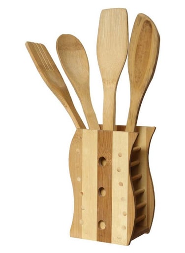 Generic 5-Piece Wooden Cutlery Set With Spoon Holder Beige/Brown 8 X 14cm