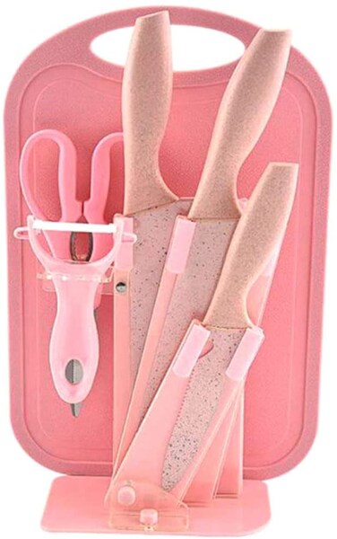 Generic 7-Piece Wheat Straw Kitchen Knife With Cutting Board Set Pink