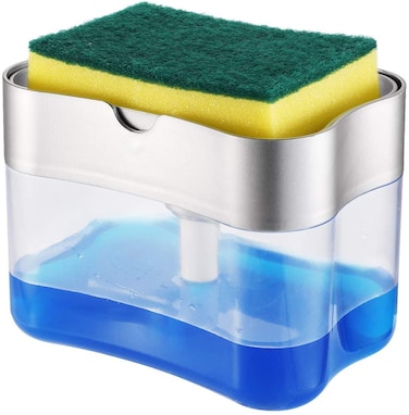 Generic Dishwashing Soap Dispenser, Soap Dispenser Sponge Holder 2 In1, Dish Soap Dispenser Caddy, Countertop Soap Dispenser, Soap Pump Dispenser, Sponge Caddy, 13 Ounces, Silver