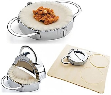 - Makes dumplings, pierogi, ravioli, turnovers, pot stickers, etc.<p>Lay a sheet of dough or pasta over, add filling then press.<p>Flip up one side to cut, seal and crimp the edges; creating a perfect packet<p>Made of stainless steel, durable and solid enough. Dishwasher safe. Easy to use and cleanup<p>Bring you more convenience and fun