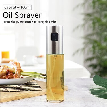 • Convenient olive oil spray for cooking. It has transparent glass body, stainless steel cap and plastic press pump. One press to make fine oil mist for making salad, frying fish, or BBQ. With it you can control the amount of the oil more easily and eat healthier.