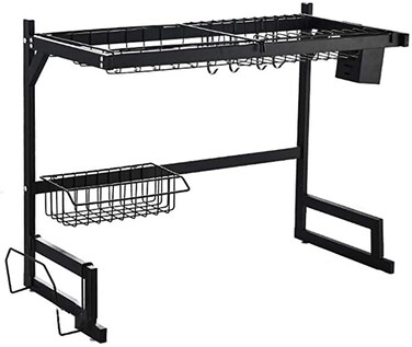 Hchao - Kitchen Stainless Steel Dish Rack, Thickened Square Tube Is Not Easy To Deform, Snap-Fit Basket, Double-Rod L-Shaped Structure, With 4 Hooks