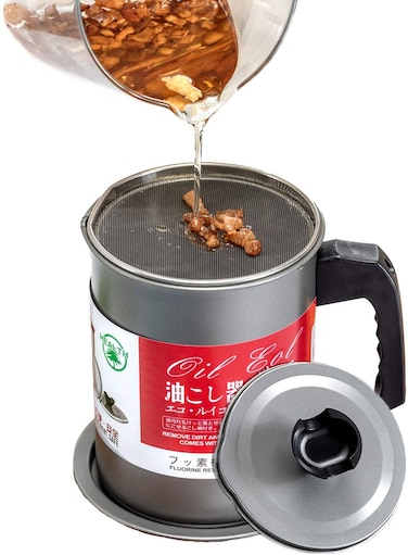 This oil keeper helps separate food from fat and reduce fat intake. The fine mesh strainer separate bits and pieces from the oil thoroughly. Perfect for storing bacon grease, oil residue, or filtering coffee grounds.