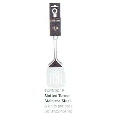 This slotted turner is constructed of durable steel and features a comfortable, ergonomic handle. It is safe to use on all cookware, including nonstick and is heat resistant. It is dishwasher safe as it is made from industrial grade stainless steel for longevity.
