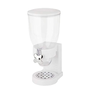 Product Description Combining contemporary styling with a user-friendly design, this portion control dry-food dispenser can hold up to 17.5 ounces of food. It is suitable for a wide variety of dry foods such as cereal, trail mix, candy, granola to nuts, beans, rice, etc. The unit's as-needed dispensing keeps food sanitary and germ-free, while its airtight seal helps prevent food from going stale and preserves freshness for up to 45 days, which means less food wasted. This food dispenser is ideal for parents as it promotes growing independence as children learn to serve themselves or for people living a healthy or weight conscious lifestyle. To use, simply place a bowl under the spout and twist the knob. The unit's portion-control system uses a soft, flexible paddle wheel that won't crush cereal, reduces messy spills, and dispenses a measured amount with each twist--about an ounce. Kids will enjoy turning the knob and watching cereal fall perfectly into their bowls, and parents can be assured that kids won't be spilling cereal all over the kitchen counter. Other highlights include durable scratch-resistant and shatterproof construction, a removable bottom tray for quick cleanup, and an easy-to-assemble design. Dimensions: 7.5 D x 6.5 W x 16.3 H , Dispenser Opening: 3-Inches from Platform. From the Manufacturer Combining contemporary styling with a user-friendly design, this portion control dry-food dispenser can hold up to 17.5 ounces of food. It is suitable for a wide variety of dry foods such as cereal, trail mix, candy, granola to nuts, beans, rice, etc.