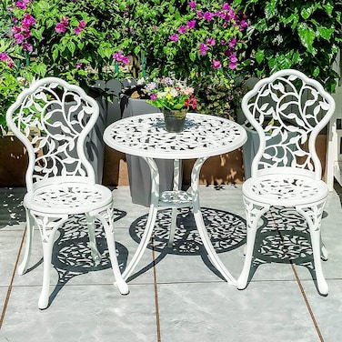 The cast aluminum outdoor patio set is designed to be weatherproof and is a more durable alternative to wrought iron patio furniture. This furniture set is powder coated to prevent rust or fading and is durable enough to withstand the elements for year-round use. Wipe down the outside table and chairs with a damp cloth when necessary for easy maintenance