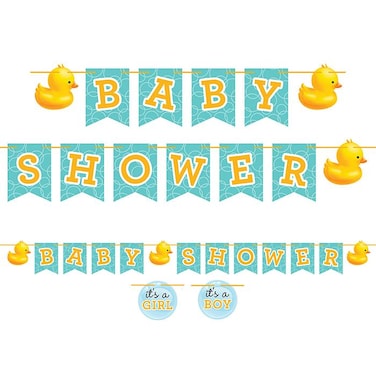 - Bubble Bath Baby Shower Shaped Ribbon Banner Rubber Ducky Shaped Ribbon Banner "Baby Shower" 6.5 ft Coordinates with pastel blue and school bus yellow solidsBubble Bath Baby Shower Theme!