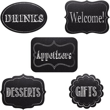 - Chalkboard Decor Assorted Cutouts. Our Chalkboard Assorted Party Cutouts are ready to be decorated to meet the needs of any occasion. Use our black chalkboard cutouts to highlight different stations, like Appetizers, Drinks and Gifts. Coordinate with the entire Chalkboard Collection for a complete look! Includes: (5) 6in x 8in assorted cutouts and 1 stick of chalk.
