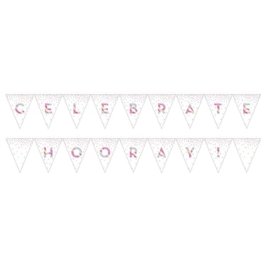 - Make a huge statement with the Iridescent Party Banner. This large 9" x 108' banner is made up of two-sided pennants that are covered in iridescent confetti. One side has the word "Celebrate" and the other has "Hooray!" in a font made of pastel iridescent colors. This banner can be coordinated with our other Iridescent Party party supplies.