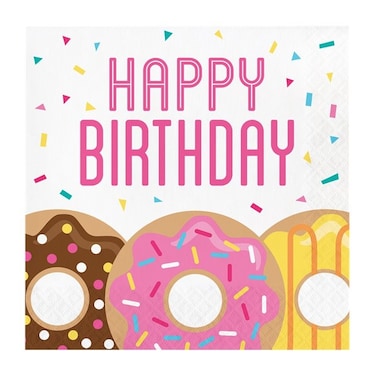 It’s time for party food! Serve tasty treats with one of these fun napkins to keep crumbs and spills at bay. The cool doughnut themed napkins will brighten up any occasion thanks to their pattern of colourful, sprinkle-topped treats. • Choose a yummy doughnut theme• 2 ply paper party napkins• Each measures 33cm x 33cm• Pack of 16