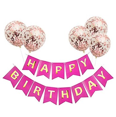 - Balloons with Rose Gold Colored Pre-Filled Confetti and Hot Pink Happy Birthday Banner Combo
