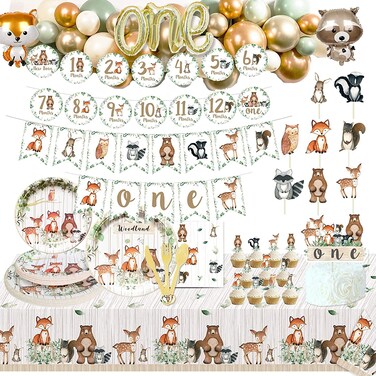 🦊Include:12 month photo banner / one banner / animal banner / cake topper*9 / cupcake topper *33 / 4.2*8.5ft table cloth *1 / 9inch plates *16, 7inch plates *16, spoon *16, knife *16, fork *16, napkin *20 / Fox and raccoon balloon / 10inch latex balloons *35 / 5inch latex balloons *10.