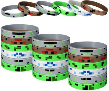 What you get: 24 pieces wristband bracelets in 4 styles, each style containing 9 packs pixelated miner crafting themed party supplies