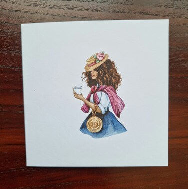A simple modern lady with brown curly hair with her take away coffee. A simple note card for any occasion.