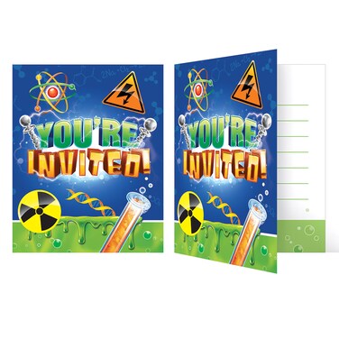 - Creative Converting Mad Scientist Party Invitations feature a foldover design with assorted science lab items printed on the front. This card is perfect for birthday party invitation. Comes with pack of 8.