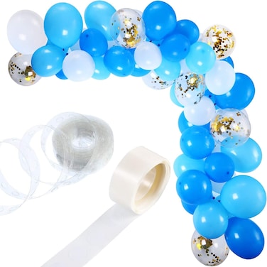 - <p>Package includes 100 pieces white, light blue, blue balloons and 10 pieces gold confetti balloons,1 roll of 100 pieces glue dot,1pc balloon knotter and 1 roll of the balloon tape strip. The size of the balloons is 12 inches each. Confetti balloons also the same size. Simply inflate your balloons and slip the knot into the holes on the decorating strip, recommend various colors and blow up different sizes to get an amazing look to your garland. This balloon garland you can use any occasion like parties, anniversary, birthday, retirement and more on.<p> Want to capture a fabulous party Instagram picture for your loveable daughter ?? buy this... click and post !!! You are just one step away <p>