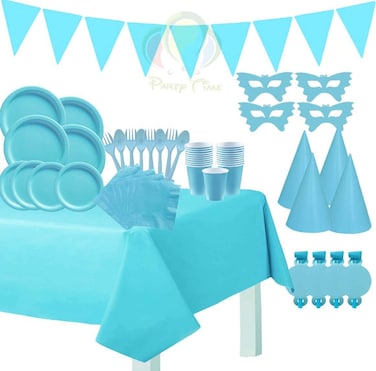 Party Time 110pcs Light Blue Party Supplies Disposable Paper Dinnerware Set Serves 12 guest Paper Plates Napkins Cups Spoon & Fork Hats Banner Table Cover Party Sets for Wedding Birthday Baby Shower