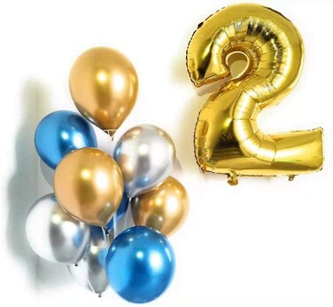 - Set Inludes: Number 2 Gold Number Foil Balloon, 3pcs Chrome Silver Latex Balloon of 12", 3pcs Chrome Blue Latex Balloon of 12", 3pcs Chrome Gold Latex Balloons of 12" and Free 1 6m Balloon Ribbon. This set can be use for birthday party or for your wedding, anniversary celebration.