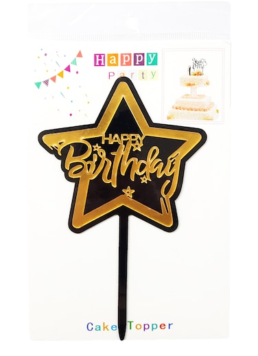 - Product Details: Material: Acrylic Quantity: 1 pc Size: 16cm x 10cm Color: Gold & Black Shape: Star Design: Happy Birthday HOW TO USE--When using the cake topper, you need to remove the protective film on the backsides. In the light, the cake topper will shine, beautiful and cool.