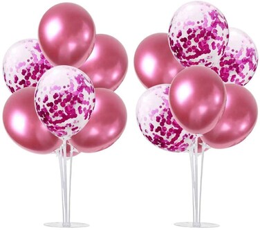 Party Time 2 Table Balloon Stand Kit 27.6" Height Balloon Sticks Holder with 16pcs Chrome Pink Latex & Confetti Balloons for Birthday Anniversary Wedding Party Bridal Baby Shower Decorations