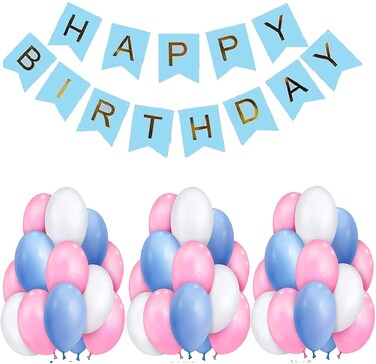 Party Time 31-Pieces Set of Blue Happy Birthday Banner & 30pcs 12" Blue Pink White Latex Balloons For Birthday Party Decoration - Party Supplies