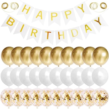 Party Time 33-Pieces Gold & White Happy Birthday Decoration Set , Happy Birthday Banner, Gold Confetti Balloons and Latex Balloons Set For Birthday Party Decoration - Party Supplies