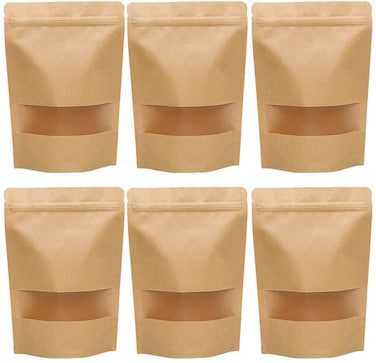 Party Time 48-Pieces 8x5.5inch Brown Kraft Food Pouches Stand Up Food Bags, Zip Lock Reusable Packing Pouches with Transparent Window and Tear Notch Thicken Heat Sealable, or Storing, Cookie, Snack Te