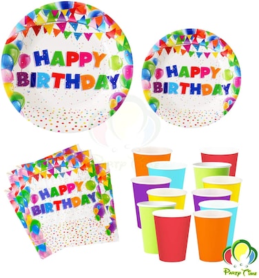 Party Time 48-Pieces Happy Birthday Party Pack 9" Dinner Paper Plates , 7" Dessert Paper Plates, 9 oz Cups, 2 Ply Napkins - Happy Birthday Party Tableware Set - Colorful Banners & Balloons Design