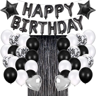 - PRODUCT DESCRIPTION: Package includes: 2 Pcs. Black Foil Curtain, Happy Birthday Foil Balloon 16", 2 Black Star Foil Balloons 18", 2 Pcs. Silver Heart Foil Balloons 18", 6 Pcs. Black Confetti Balloons 12" and 24 Pcs. White & Black Latex balloons 12". The size of the balloons is 12, 16 and 18 inches each. Simply inflate your balloons and slip the knot into the holes on the decorating strip, recommend various colors and blow up different sizes to get a amazing look to your garland This balloons garland you can use any occasion like parties, anniversary, birthday, retirement and more on. DISCLAIMER: Balloons will be delivered deflated and flat or without air.
