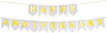 - PRODUCT DESCRIPTION: EASY ASSEMBLY: string through the pre-cut holes on the cardstocks and hang it up. White and Gold Foiled "Happy Anniversary" Sign. Package include 16pcs of Paper cardstocks and 2pcs of White Ribbon. Perfect for Any Anniversary Party Occasions, 1st Anniversary of Wedding/Loveship/Company Founding