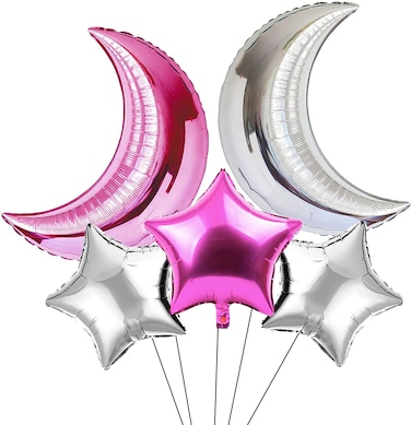 Party Time 5-Pieces Moon and Star Foil Balloons Bouquet - Baby Shower, Birthday, Gender Reveal, Eid, and Ramadan Party and Events Decoration (Pink and Silver)